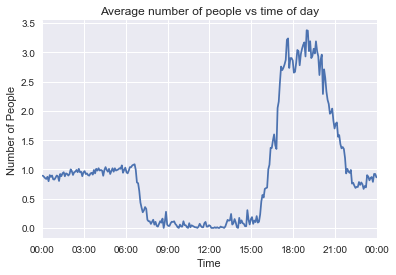 After collection over 55,000 data points, I loaded the file into a Jupyter Notebook and used Pandas and matplotlib to try and gain some insights from the data. I binned the data into windows of 5 minutes and averaged all data points withing those 5 minutes to account for variations in the number of people that YOLO counted. I then plotted the data in two ways. One plot showed the average number of people over the course of a single data and the other showed the number of people over the course of the week that I ran the experiment. It’s pretty cool how the data turned out– there is noticeable periodicity in the week graph and you can clearly see the number of people vary with closing hours and dinner time in the day graph. Pretty neat, if you ask me.