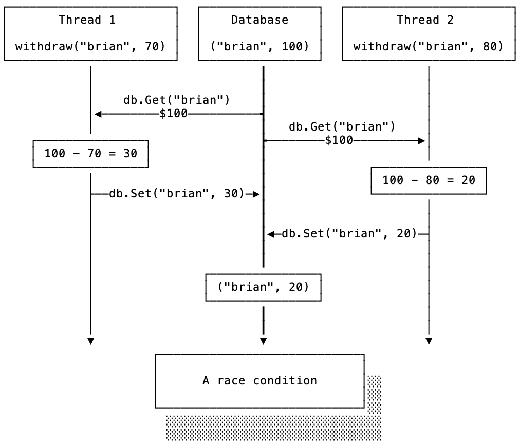 This code works perfectly if only one thread is accessing the database at a time. However, we live in a world where concurrency abounds. Applications must handle requests concurrently to serve multiple users at the same time. What happens if we call withdraw() from two threads (or goroutines) at the same time?